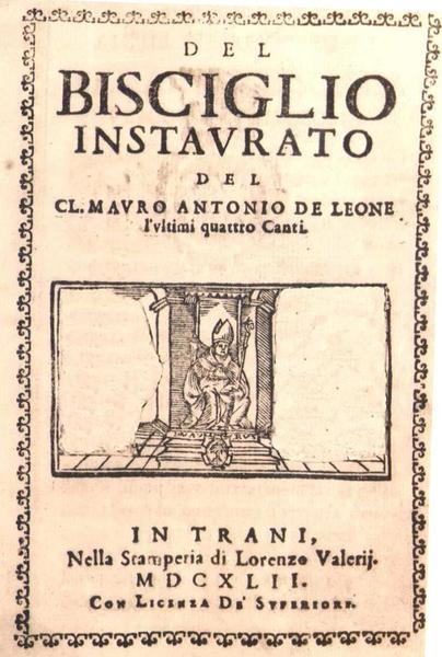 Sabato 30 settembre alle ore 19.30, presso il Museo Diocesano di Bisceglie, la professoressa Grazia Distaso, ordinario di Letteratura Italiana presso l’Università di Bari, relazionerà sull’opera di Mauro Antonio de Leone nell’ambito delle celebrazioni del Giubileo dei Santi Martiri Mauro, Sergio e Pantaleone. I quattro canti pubblicati da Valeri contengono la trasposizione in volgare e la narrazione in versi della leggenda agiografica dei santi martiri biscegliesi, le cui icone riprodotte in xilografia sono inserite sul frontespizio dell’edizione tranese.