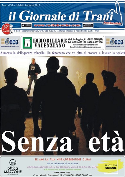 È in edicola il nuovo numero del Giornale di Trani, 18ma uscita del 2017. Titolo di copertina: «Senza età. Aumenta la delinquenza minorile, un fenomeno che va oltre la cronaca e investe la società». Fra gli altri argomenti: Grandi inchieste e rinvii; Abusivi in piazza Re Manfredi, se così sta bene a tutti; Stasi, di nome di fatto: si cercano cinque rinforzi; Amiu, prove di svolta; Via Alvarez, qui ancora non prende; Fondaco dei longobardi, tutti contro tutti; Dialoghi di Trani, dalla «bellezza» alle «paure»; Zitto zitto, il Trani è lì.