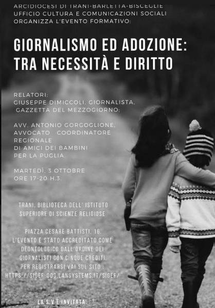 A cura dell’Ufficio Cultura e Comunicazioni Sociali dell’Arcidiocesi di Trani-Barletta-Bisceglie, martedì 3 ottobre 2017, a Trani, presso la Biblioteca dell’Istituto Superiore di Scienze Religiose (Piazza Cesare Battisti 16), dalle ore 17 alle 20, si terrà l’incontro formativo per giornalisti sul tema “Giornalismo ed adozione: tra necessità e diritto”.