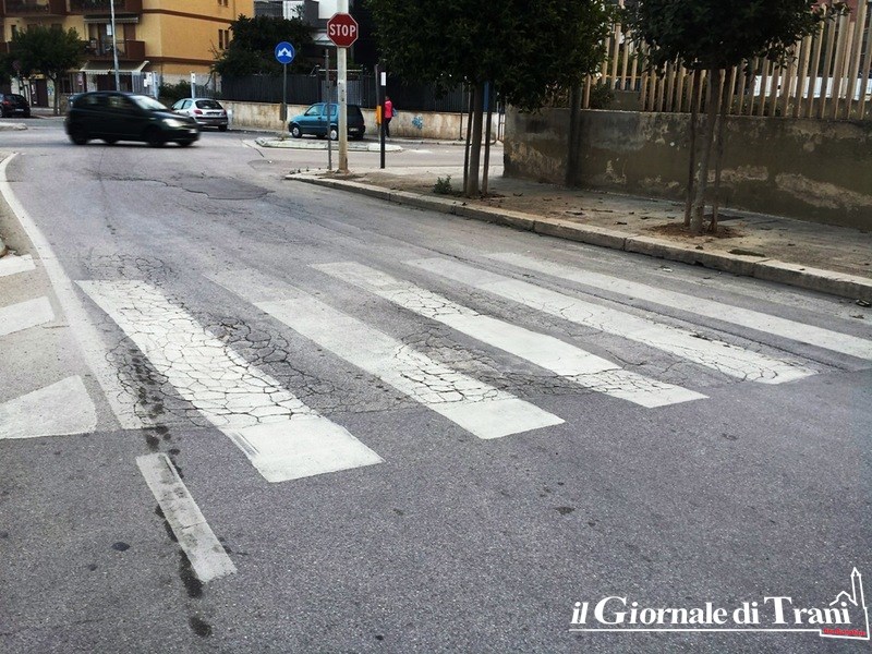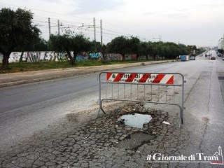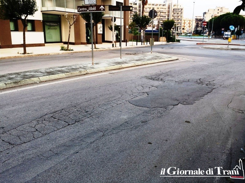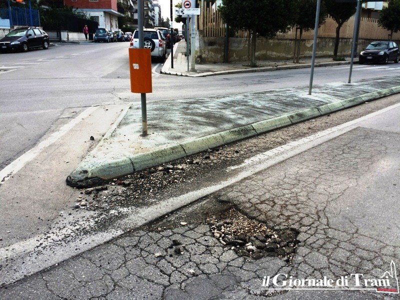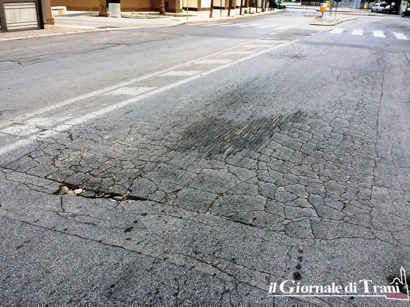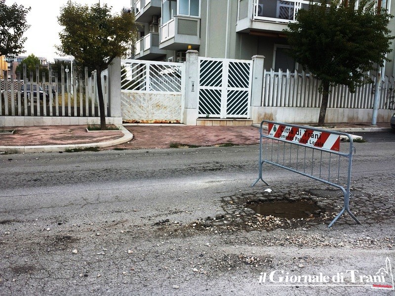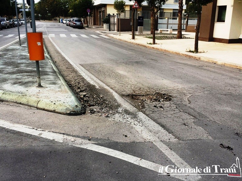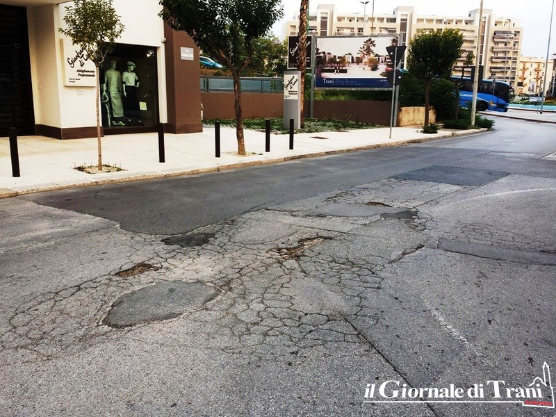 Poco più avanti, per chi scende verso il centro di Trani, poco prima di giungere alla rotatoria di via Istria, almeno 150 metri di strada totalmente dissestata, che procura notevoli sobbalzi ed altrettanto possibili danneggiamenti dai veicoli.