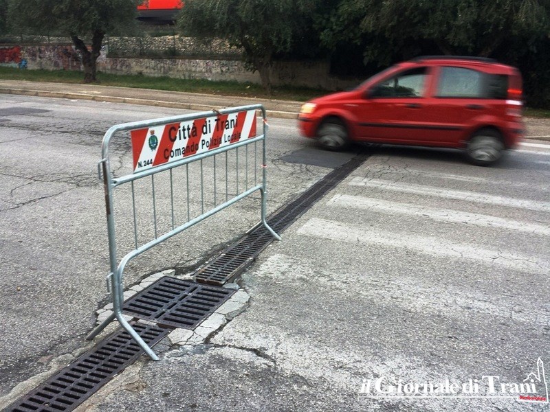 Infine le due transenne in curva nei pressi del sottopassaggio pedonale di via Verdi, già da noi segnalate, presenti ormai da quasi tre mesi, a causa della di un tombino instabile per la riparazione del quale Comune di Trani ed Acquedotto pugliese ancora non si mettono d'accordo.