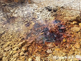 Una pietra, prelevata dal luogo prima del sequestro, sembrerebbe cosparsa di catrame o pece, o comunque materiale rilasciato dalla prolungata combustione che si sta verificando in quel sito.