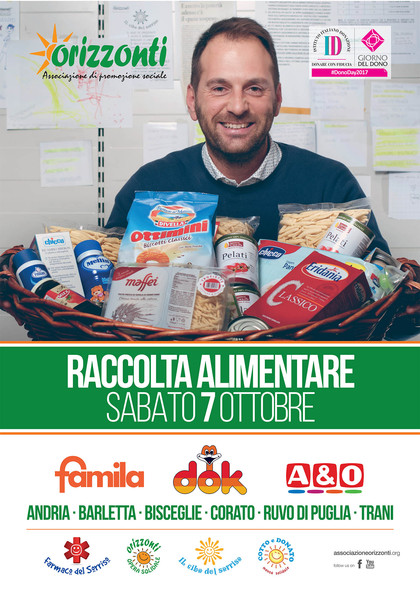 L’Associazione ORIZZONTI, che nel 2016 ha ricevuto dall’Istituto Italiano della Donazione il bollino di “Io Dono Sicuro” rientrando nel primo database italiano composto solo da Organizzazioni Non Profit verificate, a tutela della trasparenza per i donatori, aderirà al #DonoDay2017 con una Raccolta Alimentare straordinaria prevista Sabato 7 ottobre nei punti vendita DOK, A&O e FAMILA dei comuni di Andria, Barletta, Bisceglie, Corato, Ruvo di Puglia e Trani.