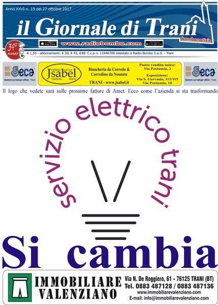 È in edicola il nuovo numero del Giornale di Trani, diciannovesima uscita del 2017. Titolo di copertina: «Si cambia», Amet si fa in due ed il futuro è già iniziato. Casa Bovio, murata ma non è ancora finita. Cava fumante, fuori controllo o quasi. Ex vigili urbani, il conto è salato. Condotta sottomarina, l'inchiesta si trasforma in un caso politico. Vito Corda e gli estorsori, il Comune è parte civile. Questo, e molto altro ancora, sul nuovo numero del Giornale di Trani, in edicola.