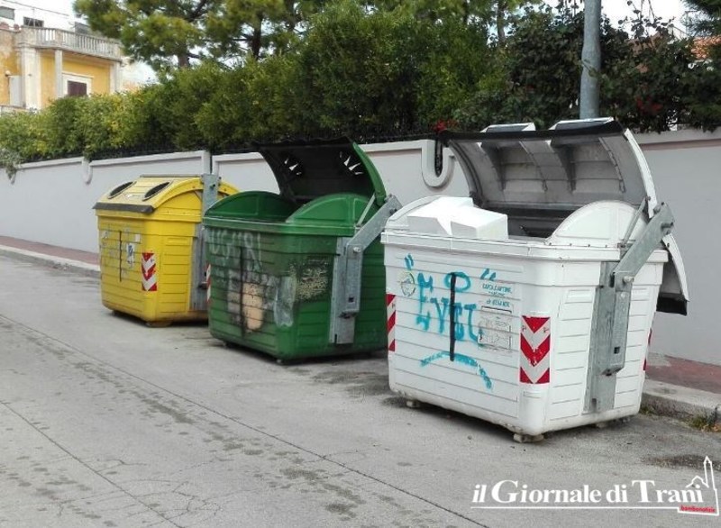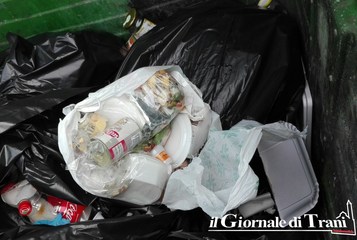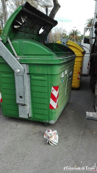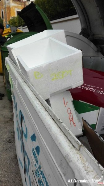 Polistirolo nel bidone della carta anziché in quello della plastica, cartacce, rifiuti di plastica nel bidone destinato alla raccolta del vetro. Questo si trova in via De Gemmis, a Trani, nei bidoni della raccolta differenziata.