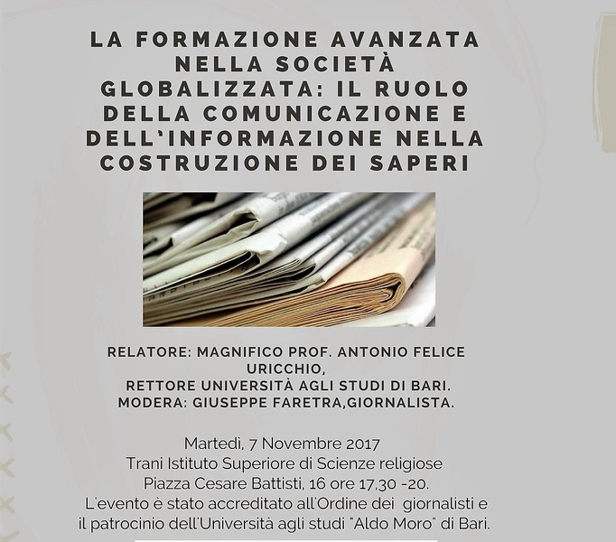 Per questo motivo all’interno di un articolato percorso di aggiornamento con una serie di seminari accreditati con vari ed eminenti relatori, l’Ufficio Cultura e Comunicazione Sociale dell’Arcidiocesi di Trani- Barletta- Bisceglie ha organizzato un seminario con la partecipazione del Magnifico Rettore dell'Università di Bari prof. Antonio Felice Uricchio, moderato da Giuseppe Faretra, giornalista e membro dell’Ufficio Cultura Comunicazioni sociali dell’Arcidiocesi, sul tema: "La formazione avanzata nella società globalizzata: il ruolo della comunicazione e dell'informazione nella costruzione dei saperi".
