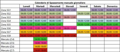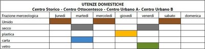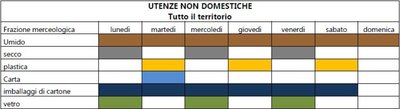 Le utenze non domestiche saranno oggetto di raccolta dell'umido tutti i giorni. Il ritiro del secco è previsto per il lunedì, mercoledì e venerdì, la plastica il martedì, giovedì e sabato, la carta martedì, gli imballaggi di cartone dal lunedì al sabato, il vetro il lunedì, mercoledì e venerdì.