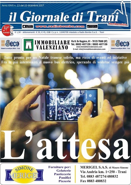 È in edicola il nuovo numero del Giornale di Trani, penultima uscita del 2017. Titolo di copertina, «L'attesa»: un Natale tutto da vivere, e c'è anche il bus elettrico.
