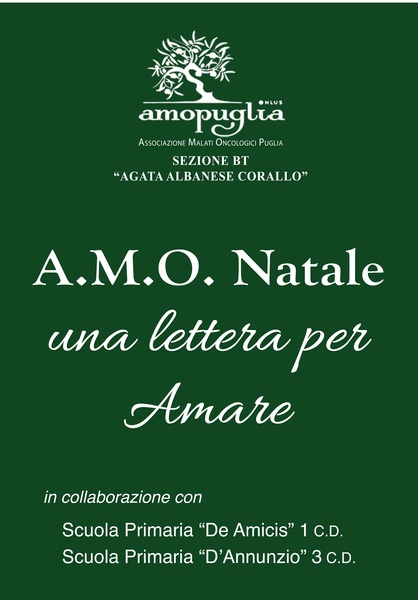 “Natale…una lettera per amare” non è la sola iniziativa organizzata dalla sezione tranese di AMOPuglia onlus per questo Natale 2017. In città una serie di appuntamenti per sensibilizzare la comunità sul progetto di assistenza domiciliare gratuita ai malati di gravi patologie. Domenica 10 e 17 dicembre AMOPuglia sarà con i suoi volontari nelle piazze principali della città con il proprio gazebo per la tradizionale offerta di panettoni, pandoro e stelle di Natale dalle 9,00 alle 13,00, il ricavato sarà devoluto all’associazione.