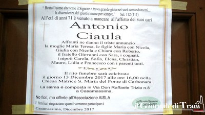 I funerali di Tonino Ciaula si terranno oggi, mercoledì13 dicembre, alle 16, nella chiesa Matrice di Carbonara. Alle 14,30 la salma lascerà la sua abitazione di Casamassima per raggiungere la chiesa.