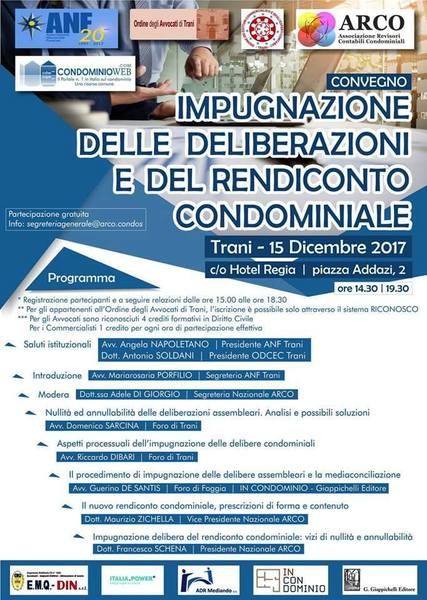Questi i relatori e rispettivi argomenti trattati: Domenico Sarcina, del Foro di Trani, su «Nullità e annullabilità delle deliberazioni assembleari, analisi e possibili soluzioni»; Riccardo Di Bari, del Foro di Trani, su «Aspetti processuali delle impugnazioni delle delibere condominiali»; Gaetano De Santis, del Foro di Foggia, su «Il procedimento di impugnazione delle delibere assembleari e la media conciliazione»; Maurizio Zichella, vice presidente nazionale dell'Arco, su «Il nuovo rendiconto condominiale, prescrizioni di forma e contenuto»; Francesco Schena, presidente nazionale dell'Arco, su «Impugnazione della delibera del rendiconto condominiale, vizi di nullità e annullabilità». Modera Adele Di Giorgio, segretaria nazionale dell'Arco.