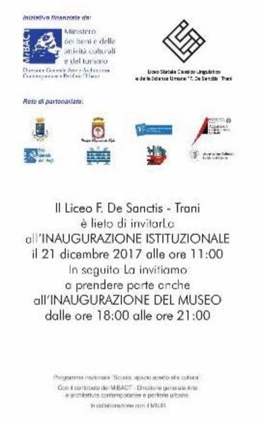 Giovedì 21 dicembre 2017 il Liceo classico, linguistico e delle scienze umane “F. De Sanctis” di Trani presenterà alla cittadinanza "Esmea – Eppur si muove! Scientific Museum Ecofriendly Arts", l’allestimento museale diffuso contenente più di 270 pezzi dell’antico patrimonio scientifico di proprietà dell’istituto, accuratamente recuperati, inventariati e catalogati.