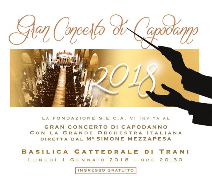 Ed anche quest'anno la fondazione torna ad ospitare il concerto dello stesso complesso orchestrale, già esibitosi lo scorso 3 gennaio in cattedrale: fu un trionfo e ne nacque la promessa di tornare. Impegno mantenuto e così, questa volta, le note della formazione pugliese risuoneranno proprio il giorno del 1mo gennaio, con ingresso libero, nell'ambito di «Sere d'incanto 2017», il cartellone degli eventi di fine anno organizzato dalla Fondazione Seca in collaborazione con Comune di Trani e Basilica cattedrale.