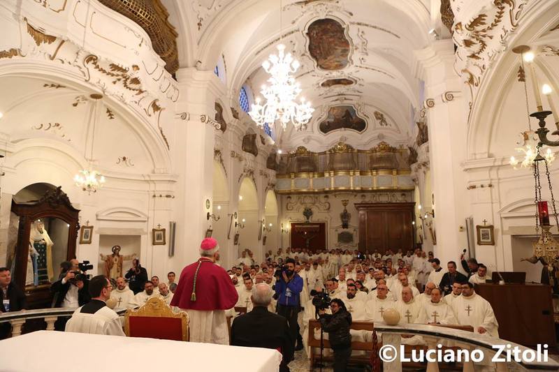 Prima della messa in cattedrale, Mons. D'Ascenzo si è recato presso la chiesa di san Giovanni per il saluto al clero diocesano e religioso, diaconi, seminaristi e rappresentanti della vita consacrata.
