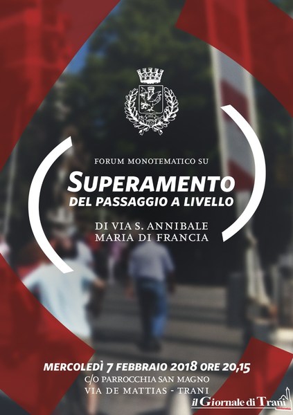 Mercoledì 7 febbraio alle 20.15 presso la parrocchia San Magno di Trani si svolgerà un forum monotematico avente ad oggetto il superamento del passaggio a livello di via Sant’Annibale Maria di Francia, alla presenza del sindaco di Trani e dell’assessore ai lavori pubblici, Giovanni Tondolo. Considerata l’estrema rilevanza che l’argomento in questione riveste, si raccomanda la massima partecipazione dei cittadini, i quali saranno invitati ad esprimere il proprio parere.