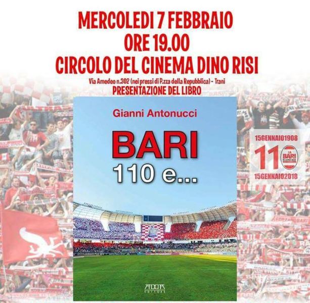 Mercoledì 7 febbraio, presso il Circolo del Cinema Dino Risi, in via Andrea Ciardi 26, alle ore 19.00 si terrà la presentazione del libro “Bari 110 e…“, un'opera in 232 pagine davvero completa di dati e di immagini sui 110 anni (1908-2018) appena compiuti lo scorso 15 gennaio dalla più antica società di calcio della Regione.