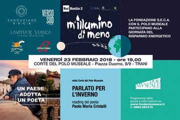 Per la prima volta prende parte a questa campagna di sensibilizzazione il Polo Museale di Trani che, grazie alla cooperazione tra Fondazione Seca, libreria Miranfù, Lavorare Stanca ed Anteas Trani ospiterà, alle 19 del 23 febbraio, “Parlato per l’inverno”, un reading di poesie speciale, unico nel suo genere, a cura del poeta abruzzese Paolo Maria Cristalli, vincitore nel 2010 del premio Fabrizio De André per la poesia. Luci basse, sguardo puntato con rilassata delicatezza all’anima per fermarsi un attimo e provare a vedere il mondo sotto un’altra luce.