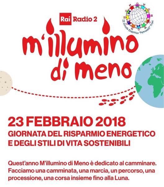 Anche quest’anno la città di Trani parteciperà a “M’illumino di meno”. Quest’anno, Caterpillar e Radio2 dedicano la quattordicesima edizione alla bellezza del camminare e dell’andare a piedi (“Perché sotto i nostri piedi c’è la Terra e per salvarla bisogna cambiare passo”). Quest’anno l’evento si celebra venerdì 23 febbraio, giorno del compleanno del protocollo di Kyoto, tentativo dell’umanità di salvare la Terra dalla distruzione indotta dai cambiamenti climatici.