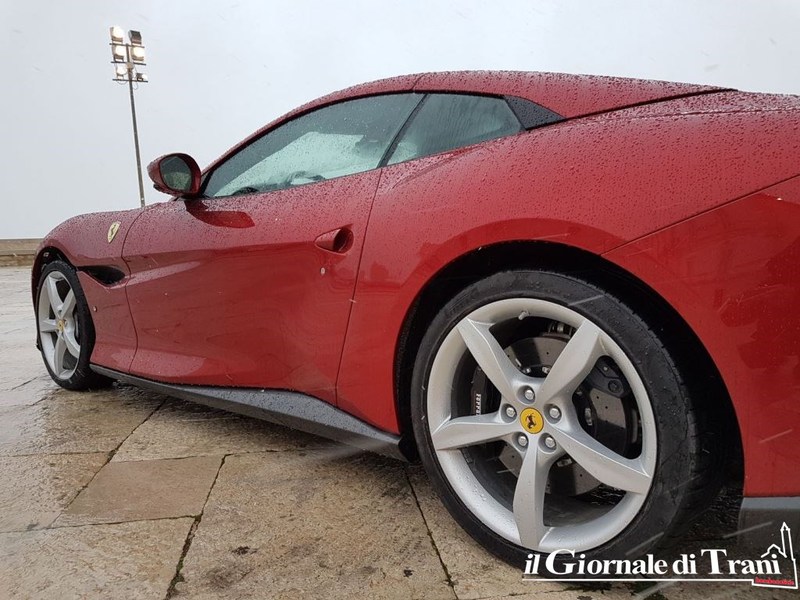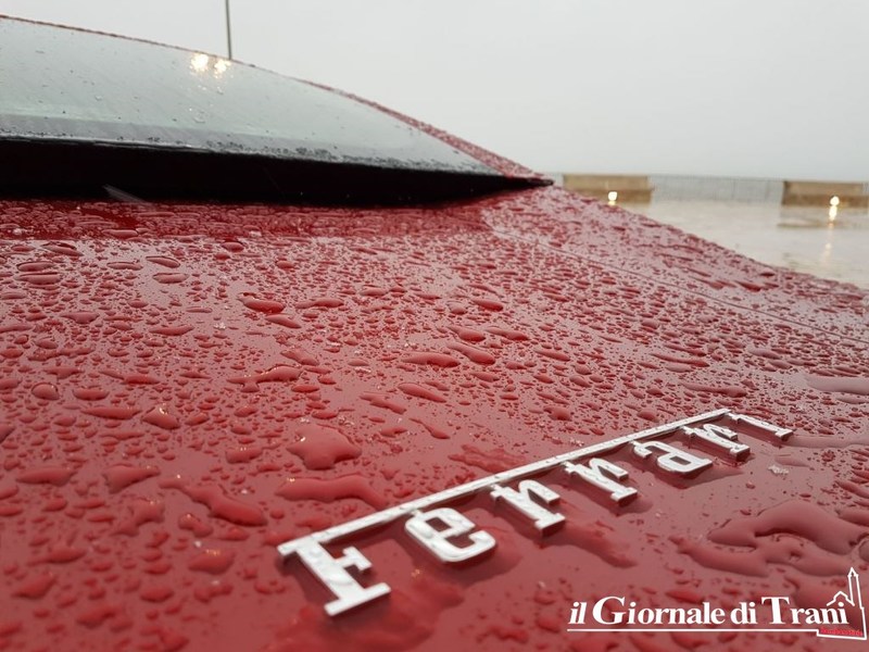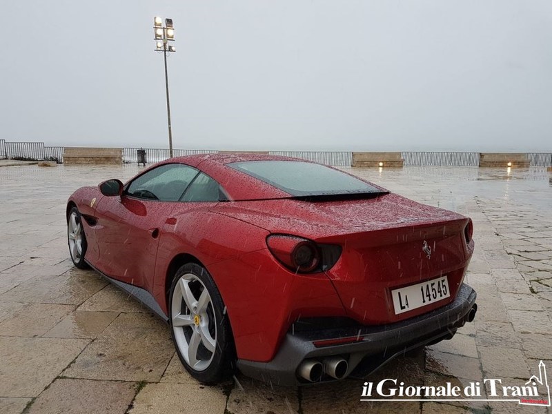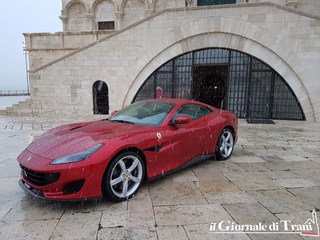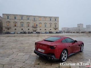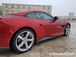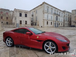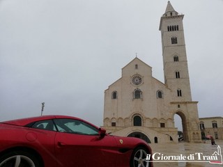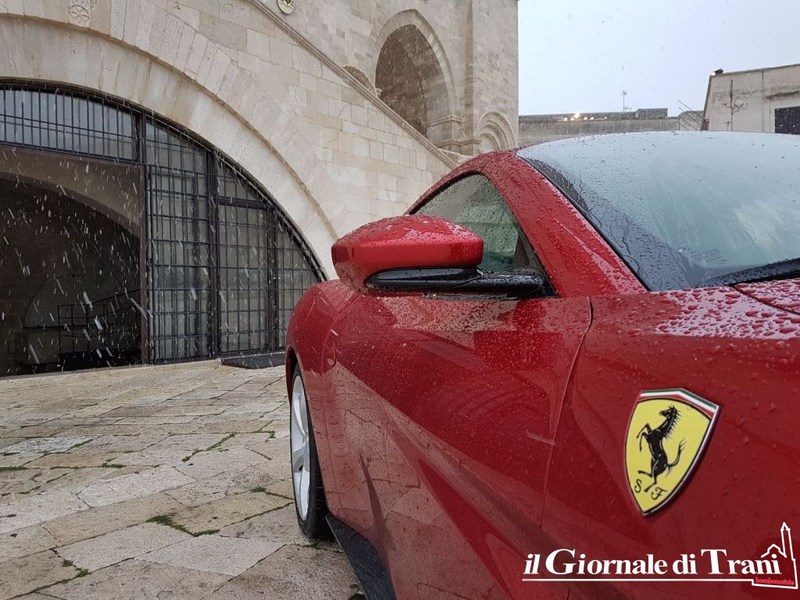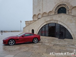 Neanche una giornata di gelo con pioggia mista a neve può fermare il fascino di una Ferrari parcheggiata dinanzi alla cattedrale di Trani. Se poi la vettura è l'ultimo modello della casa di Maranello, la Portofino, il fascino raddoppia.
