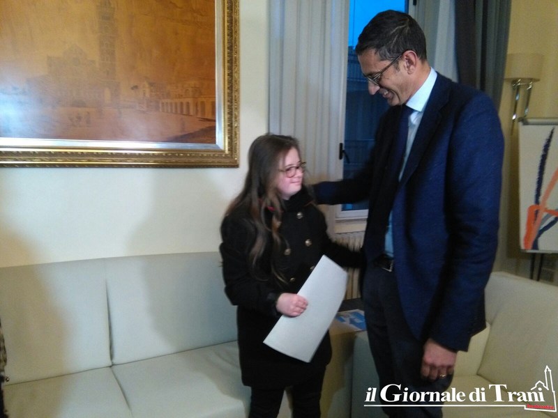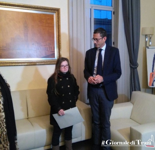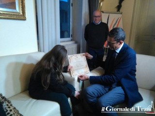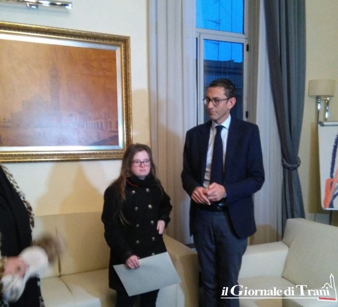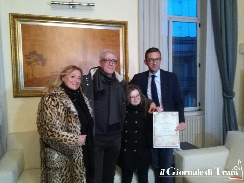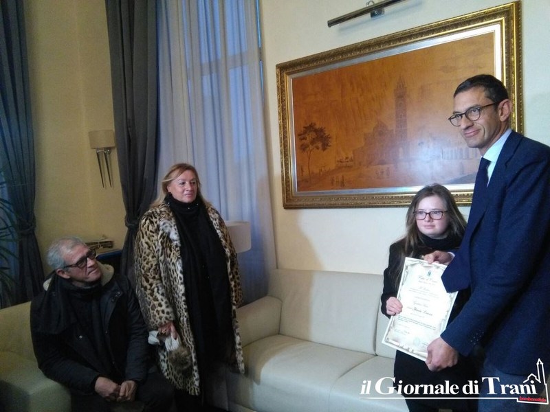 Questi risultati le hanno fatto ottenere il riconoscimento di un premio durante il festival nazionale “Il Giullare” che si è svolto a Trani la scorsa estate. La civica benemerenza “Giustina Rocca” ottenuta ieri dalle mani del sindaco viene di norma concessa ad una donna tranese che si è distinta nell’ambito della realtà quotidiana, nel campo professionale, artistico, sociale, familiare e sportivo.