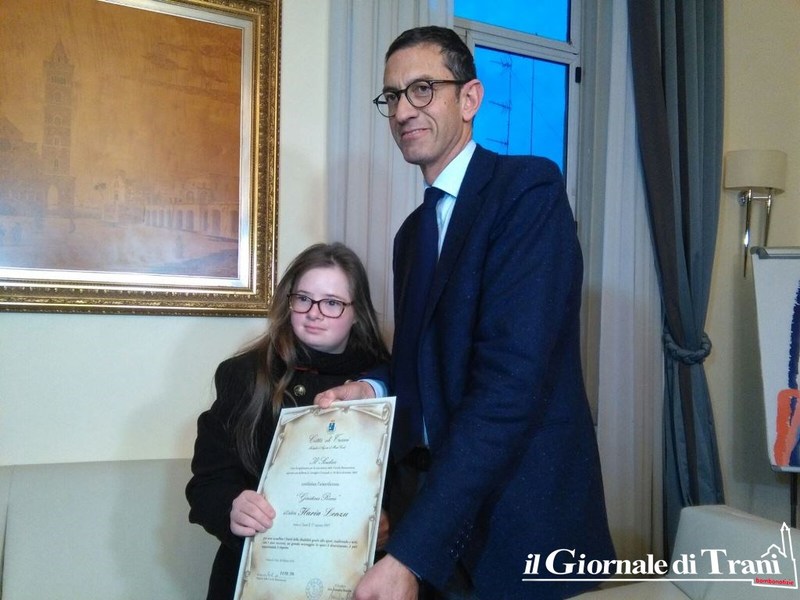 «Per aver sconfitto i limiti della disabilità grazie allo sport, trasferendo a tutti, con i suoi successi, un grande messaggio: lo sport è divertimento, è pari opportunità, è rispetto». È con queste motivazioni che ieri il sindaco di Trani, Amedeo Bottaro, ha consegnato a Ilaria Lenzu, medaglia d’oro nei Campionati assoluti di nuoto agonistico della Federazione italiana sport paralimpici degli intellettivi relazionali (Fisdir), il premio “Giustina Rocca”.