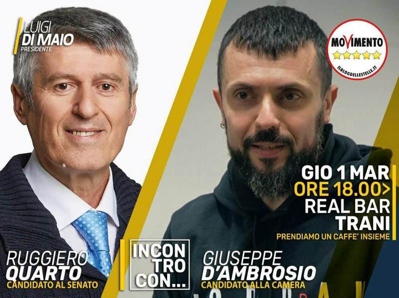 Giovedì 1mo marzo alle 18 al Real cafè di Trani, in via Bachelet 5 (angolo via Falcone), incontro con i due candidati del Movimento 5 stelle alla Camera e al Senato, Giuseppe D'Ambrosio e Ruggiero Quarto.
