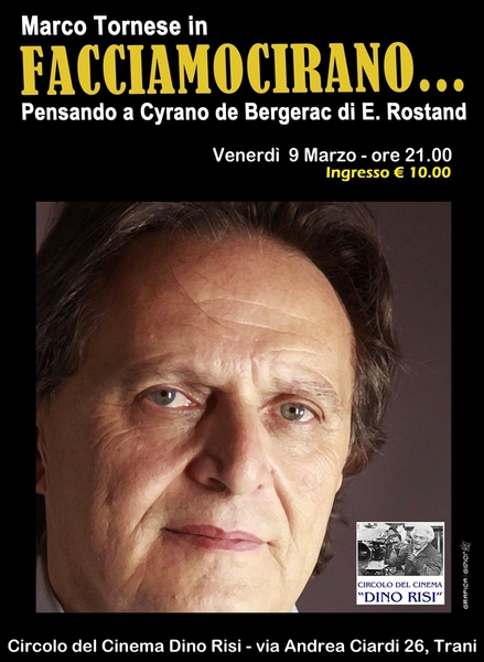 Venerdì 9 marzo alle 21 presso il Circolo del cinema Dino Risi di Trani in via Andrea Ciardi 26 si terrà un recital con Marco Tornese (coprotagonista del film “My Italy” di Bruno Colella) dal titolo “FacciamoCirano, pensando a Cirano dy Bergerac di Rostand”.