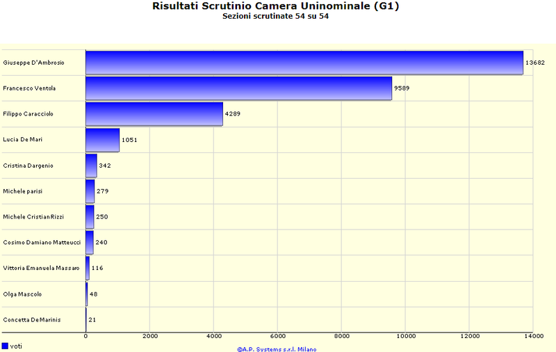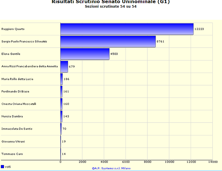 Al Senato, che è stato il primo ramo del Parlamento scrutinato, Ruggiero Quarto ha chiuso con circa 3500 voti di vantaggio su Sergio Silvestris, che a sua volta ha quasi doppiato Elena Gentile.