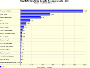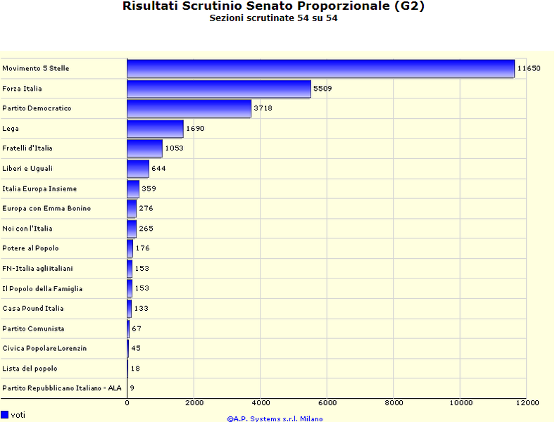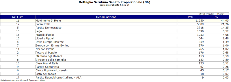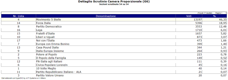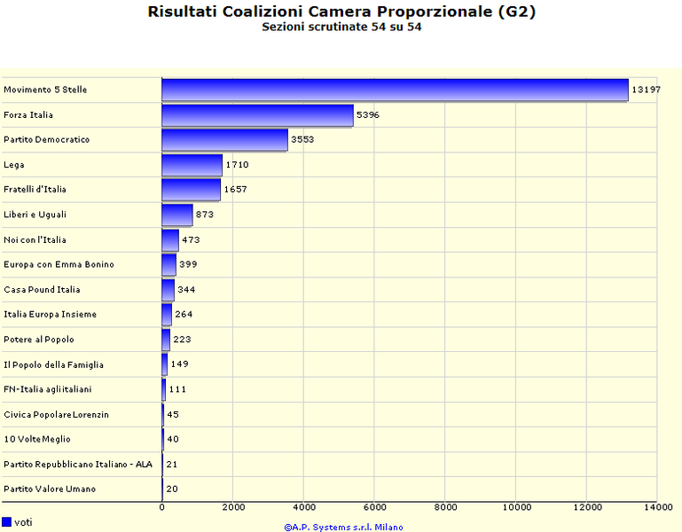 Anche nel proporzionale della Camera il distacco tra Movimento 5 Stelle e Forza Italia si amplifica: 13197 voti, contro 5396. Il Pd si ferma soltanto a 3553, Lega e Fratelli d'Italia sgomitano dietro il partito di maggioranza relativa a Trani, poi quasi il nulla.