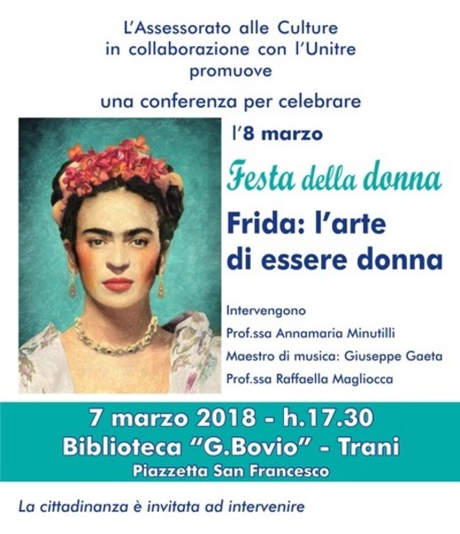 L’Assessore alle culture, in collaborazione con l’UniTre, promuove una conferenza per celebrare la Giornata mondiale della donna, presso la biblioteca comunale, mercoledì 7 marzo, alle 17.30. La profesoressa Anna Maria Minutilli, docente di Storia dell’Arte presso l’UniTre, presenterà la figura e l’opera di una delle artiste più famose e amate del Novecento: “Frida Kahlo. L’arte di essere donna”.