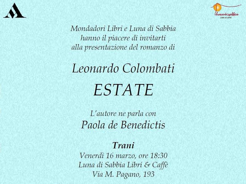 Venerdì 16 marzo alle 18.30 presso la libreria Luna di sabbia, in via Mario Pagano 193/195, ci sarà la presentazione del romanzo “Estate”, di Leonardo Colombati. Dialogherà con l’autore la poetessa tranese Paola De Benedictis. L’evento è organizzato da Mondadori Libri e Luna di sabbia.