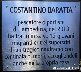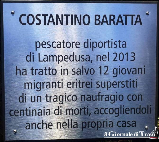 Designato ufficialmente lo scorso 6 marzo, Baratta è stato formalmente insignito del riconoscimento ieri, nel Giardino dei giusti di Milano, il più importante d'Europa dopo quello di Gerusalemme, dal sindaco della città, Beppe Sala, nel corso della manifestazione in cui, insieme, il primo cittadino meneghino ed il muratore tranese trapiantato a Lampedusa hanno scoperto la piccola targa che recita così: «Costantino Baratta pescatore diportista di Lampedusa, nel 2013 ha tratto in salvo dodici giovani migranti eritrei, superstiti di un tragico naufragio con centinaia di morti, accogliendoli anche nella propria casa».
