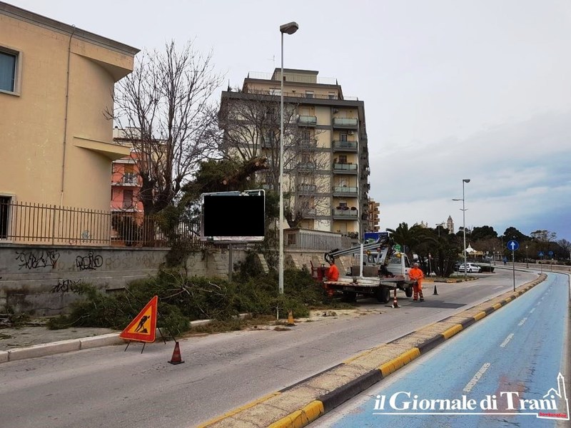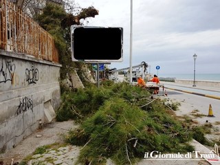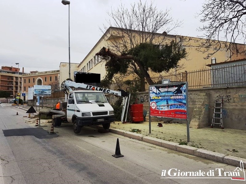 Sarebbe potuto cadere da un momento all'altro, forse già sarebbe caduto se non l'avesse sorretto un impianto pubblicitario abusivo. E così, per una volta, la pubblicità stradale contro legge è riuscita, almeno, a salvare i pedoni dai possibili pericoli dovuti alla ormai scarsissima stabilità di un pino situato all'interno del cortile della scuola media Giustina Rocca, nella porzione adiacente il lungomare Chiarelli.