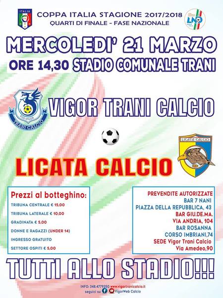 Per quanto riguarda la gara infrasettimanale di campionato che si sarebbe dovuta disputare giovedì 22 ad Otranto, la Federazione pugliese ha deciso di posticipare la sola partita che riguarda la Vigor e non l'intera giornata. Otranto-Trani si giocherà quindi sabato 24 marzo alle 15. A nemmeno tre giorni dall'impegno contro il Licata.