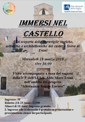 Il castello Svevo di Trani e gli studenti della 3^F dell’istituto tecnico “Aldo Moro” di Trani saranno lieti di accogliere i visitatori mercoledì 28 Marzo, dalle ore 16, per accompagnarli alla scoperta della storia e delle bellezze dell’affascinante fortezza federiciana di epoca medievale, edificata in riva al mare a breve distanza dalla monumentale cattedrale.