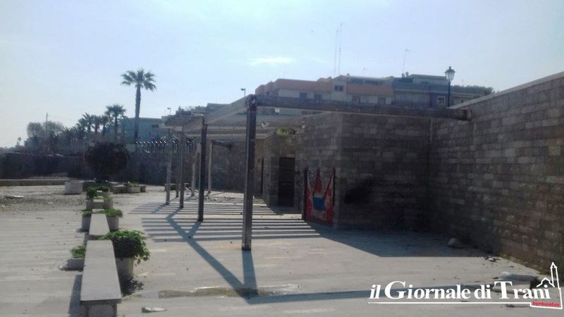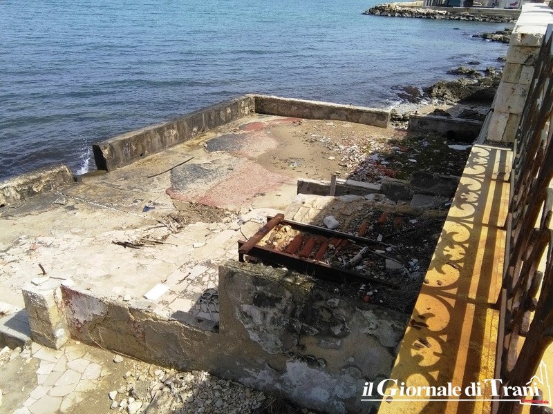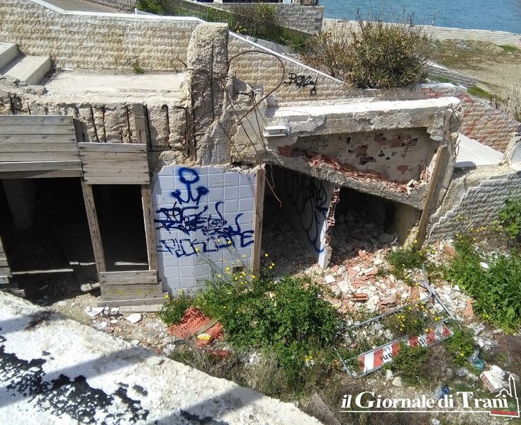Riqualificazione che sarebbe più che opportuna per valorizzare quell’area. Qui si trova anche una transenna di proprietà del Comune di Trani, adagiata tra le strutture fatiscenti e le erbacce, rimasta evidentemente dal vecchio sequestro.