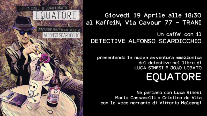 Giovedì 19 aprile alle 18.30 al Kaffein di Trani in via Cavour 77 “Un caffè con il detective Alfonso Scardicchio”, presentando la nuova avventura amazzonica del detective nel libro di Luca Sinesi e João Lobato, “Equatore”.