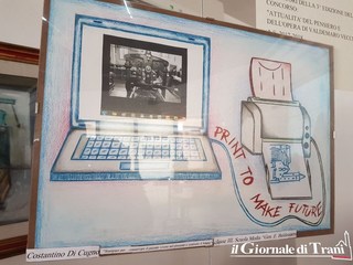 Primo classificato ex aequo categoria opera di pittura - Dario Amorese, II G Baldassarre, “per l’originalità dell’opera che spinge a vedere oltre grazie alla lettura dei libri” e Costantino Di Cugno, stessa classe, “per il ritmo compositivo legato al tratto sicuro e alla scelta cromatica delle tonalità dell’azzurro che rendono l’immagine di un passato che può aiutare a vivere un futuro ricco di cultura”.