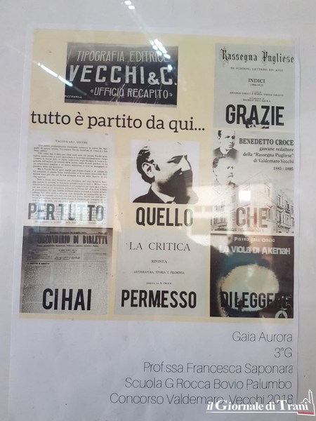 Primo classificato categoria elaborato scritto – Daniela Marzulli e Valeria Salerno, III F Battisti Ferraris, “per aver approfondito nell’elaborato il tema dell’arte e aver tracciato delle linee di possibile sviluppo culturale per la nostra terra a aprtire dall’esempio del tipografo-editore Vecchi”.