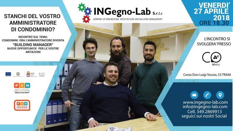 Oggi, venerdì 27 aprile, alle ore 18.30, in occasione dell’apertura dello sportello territoriale INGegno-Lab Srls zona Pozzo Piano, presso il coworking Co-Labory, in Corso Don Luigi Strurzo 53, a Trani, si terrà l'incontro "INGegno-Lab S.r.l.s.: nei Condomini l’amministratore diventa Building Manager", una occasione per conoscere e informarsi sui vantaggi e i servizi legati al nuovo modo di gestire i fabbricati in ambito condominiale detto "building management" e dialogare con un team tecnico e specializzato su svariati temi ad esso correlati.