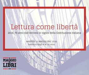 Ciclo “Lettura come libertà” – Lo sviluppo ed esercizio della libertà individuale, di pensiero critico e quindi di azione, si affina grazie alla lettura. Ma non solo: libertà è anche saper scegliere cosa, come e dove leggere, avere il coraggio di essere se stessi e affrontare la vita. Non dimentichiamo che nel 2018, inoltre, ricorrono i 70 anni dall’entrata in vigore della Costituzione italiana i cui principi si fondano proprio sulla libertà.
