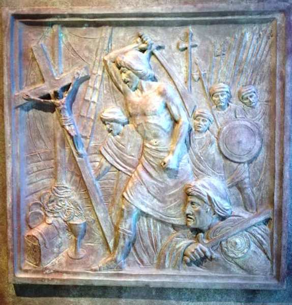 La nave, tuttavia, non voleva saperne di ripartire e così il capo dei pirati, Dulcinio, attribuendo ogni colpa al crocifisso, sguainò la sciabola e, con un colpo deciso, sfregiò il crocifisso sul volto e lo gettò in mare. Il veliero riuscì a salpare mentre il crocifisso, in balia delle onde, galleggiava mentre sul volto cominciò a fuoriuscire del sangue.