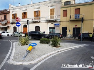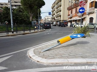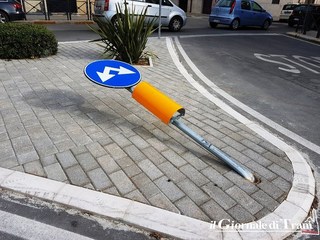 Dal 20 aprile al 14 maggio: è durata tre settimane l'integrità del segnale posto al vertice basso dell'isola spartitraffico recentemente realizzata nell'area di svincolo di piazza Natale D'Agostino, all'intersezione con via Tasselgardo e via Vischi. Nel corso della notte un veicolo, probabilmente cambiando direzione all'ultimo momento, ha abbattuto il segnale che, adesso, dopo la nostra segnalazione, è stato sostituito alle 11.45.