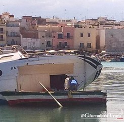 Al termine di una lunga e complessa mattinata di lavori, il peschereccio semi affondato è stato messo in sicurezza, mente l'altro era stato già ormeggiato al suo solito posto, nei pressi di piazza Sedile San Marco, con la prua danneggiata ma in perfetta linea di galleggiamento.