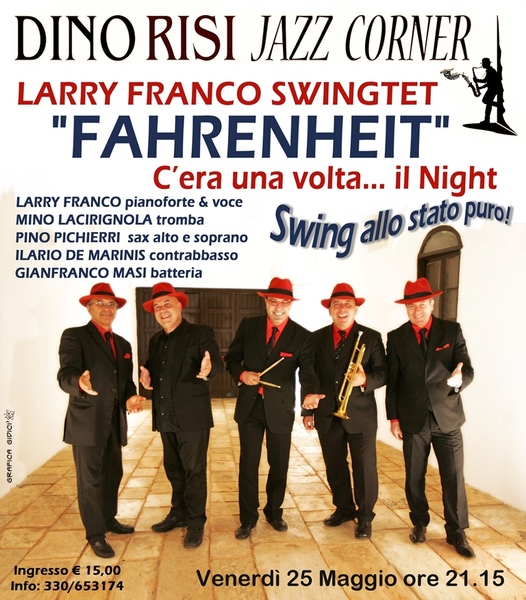 Venerdì 25 maggio alle 21.15 appuntamento di chiusura della stagione del Dino Risi jazz corner (via Andrea Ciardi 26) con la storica formazione di Larry Franco, un quintetto strepitoso che suona "Swing allo stato puro" (Fred Buscaglione, Nicola Arigliano, Bruno Martino, Renato Carosone), in un progetto dedicato interamente alla musica da night con gli arrangiamenti originali di Larry Franco.