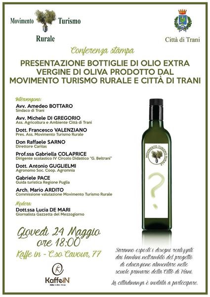 Giovedì 24 maggio alle 18 presso il locale Kaffein, in corso Cavour 77, si terrà una conferenza stampa di presentazione delle bottiglie di olio extravergine d’oliva prodotto dal Movimento turismo rurale e dalla Città di Trani.