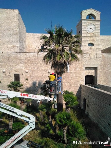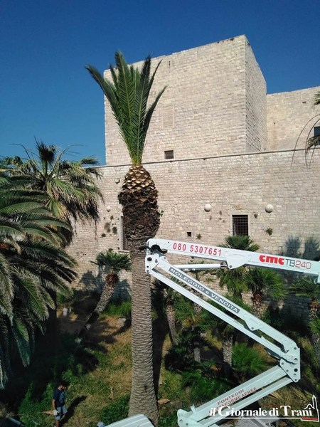 Sono in corso da questa mattina i lavori di potatura delle palme presenti nel fossato del castello di Trani. Curioso che l'intervento avvenga in vista della presentazione, prevista per questo pomeriggio, della mostra "Federico II e il De arte venandi cum avibus".