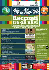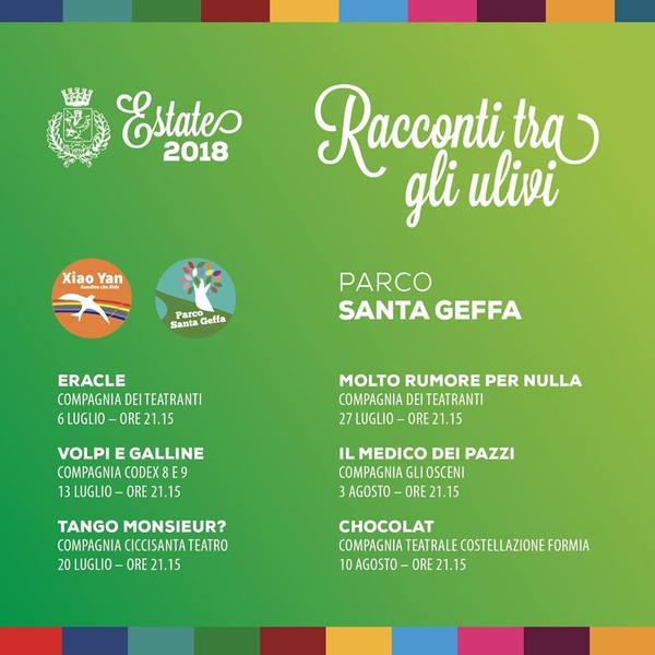 Presso il parco santa Geffa di Trani si terrà la rassegna "Racconti tra gli ulivi". Sei appuntamenti, sei spettacoli teatrali, pensati ed organizzati da Xiao Yan in collaborazione con Enzo Matichecchia e Lella Mastrapasqua della Compagnia dei Teatranti di Bisceglie.