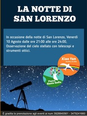 Sempre venerdì 10, in occasione della notte di San Lorenzo, dalle ore 21 alle ore 24 sarà possibile osservare il cielo stellato con l’utilizzo di telescopi e strumenti ottici. Così, nello scenario del parco Santa Geffa si potranno vedere da vicino la Luna e le stelle.