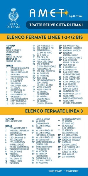 Partirà domani, venerdì 6 luglio, e terminerà a fine settembre il servizio estivo del trasporto pubblico locale da parte di Amet Spa. Lo hanno presentato oggi il sindaco, Amedeo Bottaro, ed il presidente del Consiglio di amministrazione, Antonio Mazzilli, ospitando i cronisti al bordo di una delle circolari per effettuare l'intero nuovo percorso della linea 3.